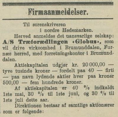 - «Globus Maskinfabrikk i Brumunddal kjøpt av A.s Kverneland Fabrikk», Hamar Arbeiderblad 14. april 1955 s. 3