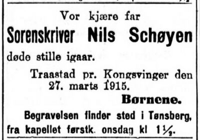 Dødsannonse i Aftenposten 30. mars 1915 for Nils Schøyen.