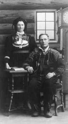 Birgit og Olav Nesland. Biletet er teke av fotograf Køhn i Kristiansand kort etter at dei gifte seg i 1910. Frå Setesdalsmuseet.