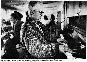 Fra i slutten av 60-årsalderen ble Norbom ofte det selvfølgelige midtpunkt i Soon Pensjonistforenings møter, her ser vi av avisreferatene at han ble satt stor pris på av publikum – og ikke minst fra de som til enhver tid ledet pensjonistforeningen. Noen ganger møttes de på «lokalet» og andre ganger på menighetshuset. Han spilte «gode, gamle melodier fra den gang da…» - også da Soningene hadde invitert «kolleger» fra Vestby. Da Son Eldresenter i 1993 starta med sine fredagskafeer sørget «Norbom Fredriksen for søte fredagstoner». Siste pensjonisttreff han var til stede på fant vi var 16. mars 1995. Men det bød seg nye anledninger, ja et nytt marked i 1996. Da fikk han være med i to bryllup – og spilte opp til dans og underholdning for gjestene. Hans musikalitet ga seg og til kjenne da han danset jentene slitne, heter det i nekrologen over ham i lokalavisene.[15]