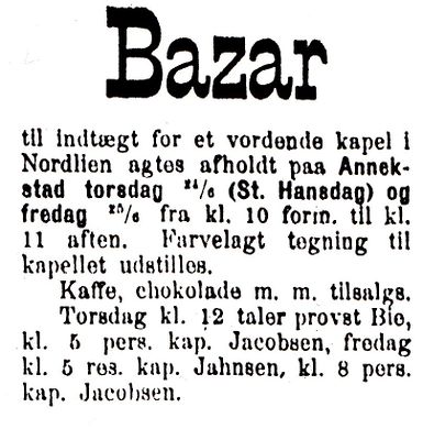 Sommeren og høsten 1900: "20. 21. og 22. Juni Kirkebasar paa Breli til indtækt for Nordliens Kapell mange gjenstande forarbeidede af Nordliens Jenter og givet av forskjellige. Indtækt cirka 1100 kr."(...)"13. Juli arbeide paa Kirkegaarden 8 Mand og 4 Hester Jeg Even og Kristian og 2 Hester 1 Mand og Hest ifra Berg 1 Mand og Hest ifra øvre Bjørnstad 1 Mand fra O. R. Nøkleberg. 1 Mand fra Groset. 1 Mand fra Sandager, meget varmt Veir"(...)"Lørdag 13 Oktob paa Kirketomten og uplanere Vangen og kjørte Sten i alt 16 Mender herifra Jeg Kristian ifra kl 12 Even og Gustaf og 1 Hest. Solber 2 M og 1 hest Berg 1 M og 1 Hest. Kr. Nøkleberg 1 M. E. Nøkleberg 1 M Sanager 1 M Groset 1 M Jørgenset 1 M Bjørnstad 1 M Ødegaard 1 M og N Faukald, I. Bjertnæs."
