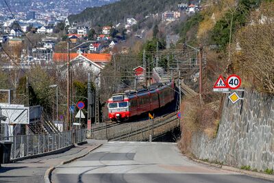 Nordstrandveien med tog på Østfoldbanen og bebyggelsen langs Mosseveien med sentrum i bakgrunnen.