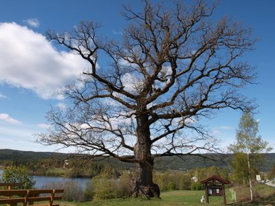 - Naturminnet Den gamle mester. I bakgrunnen, på den andre siden av Krøderen, ses eventyrmuseet Villa Fridheim.Foto: Siri Iversen (2014).