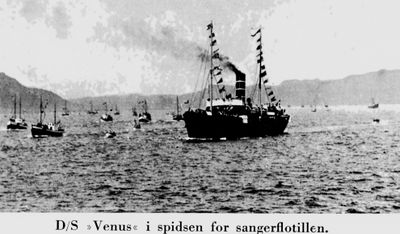 Vel om bord i det gode været, startet sangprøvene straks de forlot Harstad og det fortsatte helt fram. Hovedkomiteen la an på at sangerforbundene Nord-Norge, Nordland, Trondheim, Romsdalsbyene, Haugesund, Stavanger og Vest-Agder skulle møte med sine skip ved Hjelteskjær – Follesø 1. pinsedag kl. 0730. Pinsedagen opprant med nydelig pinsevær, sol og atter sol. Sangerne fra Harstad, Tromsø og Hammerfest som ankom med hurtigruteskipet «Hera» pinseaften, ble de første. De fikk således ikke være med i den storslåtte flotiljen av «sangerbåter» som stevnet inn fjorden fra Hjelteskjær, anført av D/S «Venus» som for anledningen var fylt med 450 bergenssangere og en hel del æresgjester for å lose gjestene inn til byen. Trønderne i «Dronning Maud» fulgt av «Møre Jarl» med sangerne fra Romsdalsbyene, «Kong Harald» med folket fra Vest-Agder, tett fulgt av «Gann» som var lastet med sangerne fra Stavanger, haugesunderne i «Karmsund» og til sist Nordlands Sangerforbund med D/S «Folden». Ca. kl. 0930 klappet flåten til kai, og sangerne inntok Bergen – uten sverdslag, og snart, rett fredelig, følte de seg som hjemme. De marsjerte gjennom Bergenhus Festning der barnekoret som besto av godt og vel 3 500 gutter og piker, hadde tatt oppstilling og hilste sangerne med flagg og glade tilrop. (Se foto av sangertoget som passerer tyskebryggen). Videre gikk turen forbi Håkonshallen, Rosenkrantztårnet og over Festningsplassen, innover Slottsgaten, og over Tyskebryggen til Torvet, så svingte de inn på festplassen ved Holberg-statuen foran Børsen, hvor den første offisielle sangerhilsen ble utvekslet. Flere 10-talls tusen var møtt fram og skapte en fin ramme med livlige hilsener med vifting og hurrarop. Høy tid, som ble avsluttet med «Ja vi elsker» av om lag 2 400 sangere. Herfra gikk ferden til sangerhallen; 36 x 72 meter med sitteplass til 4 500 tilhørere og et podium med plass til 2 500 sangere. Foran talerstolen var anbrakt en laurbær-kranset byste av Johan Didrik Behrens, som er blitt definert som skaperen av norsk mannskorsang. Bergenssangerne framførte «Hilsningssangen» til melodi av «Jeg tok min nystemte». Taler ble holdt og «Ja vi elsker» avsunget, før prøvene tok til.