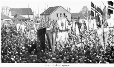 Stevnets æresdirigent, Iver Holter gjorde stor furore da han dirigerte felleskoret av 2 500 sangere med fedrelandssangen som avslutning på første festkonsert i en stappfull Sangerhall.