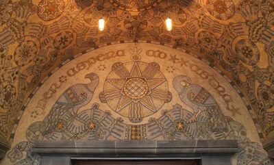 Vegg-/takmaleri av Enevold Thømt fra 1915 ovenfor inngangen til biblioteket i Hovedbygningen på Gløshaugen.
