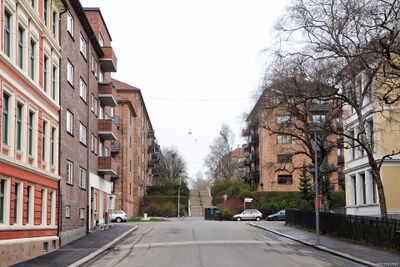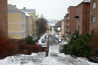 Sett sørover fra Trysilgata. Her er gateløpet brutt av trapper. Til venstre, Kampen skole.