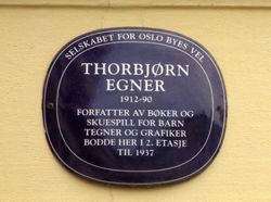 - Nr. 5: Blå plakett til minne om Thorbjørn Egner.Foto: Stig Rune Pedersen
