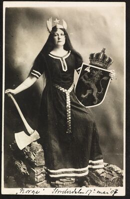 Personfikasjon av «Moder Norge». Kortet er datert 1907, og slike motiver var svært populære i åra etter unionsoppløsninga.