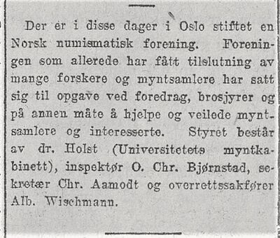 Faksimile fra Dagbladet 31. mars 1927; notis om etableringen av Norsk Numismatisk Forening.