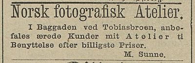 Tre år etter at konen døde i Porsgrunn viser folketellingen 1865 at han arbeider som «conptorist» i Statsbygd prestegjeld i Sør-Trøndelag. Sunne er bosatt på Ingdals nedre med Grostad, og har Agnes, Valborg og Klara hos seg. Den samme folketellingen viser at Ovedia er pleiedatter hos den eldste datteren som er gift med skipsfører Henrik Wright. De befinner seg i Porsgrunn. Senere reiser familien tilbake til Østfold, og bosetter seg i Bakgaten 2 (i folketellinger nr. 83) ved Tobiasbroen, der han har sitt fotografiske atelier. Denne bedriften får navnet «Norsk fotografisk Atelier», og frem til 12. oktober averterer han jevnlig for sine tjenester i Fredriksstad Tilskuer. 20. oktober skifter bedriften navn til «M. Jacobsen & Sunne» da Hr. M. Jacobsen ansettes som medarbeider. Fra 1873 annonseres «M. Jacobsen & Sunne»s tjenester regelmessig i samme avis.