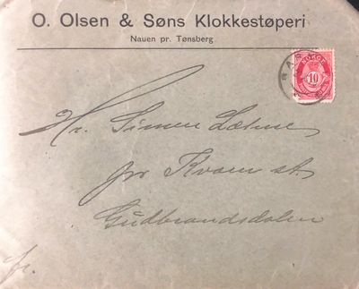 Brev datert 23. november 1918 fra Olsen Nauen til bonden Simen Lehne, Nord-Fron. Konvolutten inneholdt blant annet pristilbud på gårdsklokke.