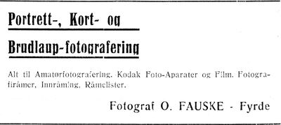 Han gikk i lære i Bergen i 1905 og begynte som fotograf i Naustdal i Sogn og Fjordane. Reiste mye rundt og fotograferte i hjembygda, mest prospektkort. Etablerte seg etter hvert med atelier i Førde. I 1912 grunnla han firmaet O. Fauske, som etter hans død ca. 1943/44 ble overtatt av Tom Vassdal. Denne sluttet i 1946 for å dra til Amerika, og firmaet ble da overtatt av Fauskes brordatter Ingrid Fauske Grov og ektefellen John Grov. De forandret firmanavnet til Førde Fotoatelier, og drev det til 1961. Medlem av Fotografernes forening 1915.