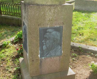 Olaus Skaugen er gravlagt på Gamle Aker kirkegård i Oslo. Gravminnet har portrettrelieff av både ham og kona, og tittelen brukseier er benyttet.