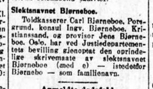 Flere av barna til Ole Andreas Jensen Bjørnebo tok senere navn og skrivemåten Bjørneboe. I påtegning i kirkeboka fra Ingvalds dåp i 1875 heter det: "Ifl Justisdepartementets bevilling av 27/11 26 meddelt tillatelse til å anta navnet Bjørneboe som slektsnavn. Attest 20/2 42."[10]