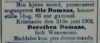 I folketellingen for 1900 er Ole Domaas registrert på adressen Sofies gate 1 i Kristiania, sammen med kona og to ugifte, voksne døtre. Døtrene, Marit og Gudrun, er registrert som henholdsvis assistent i Christiania sparebank og lærerinne i folkeskolen.