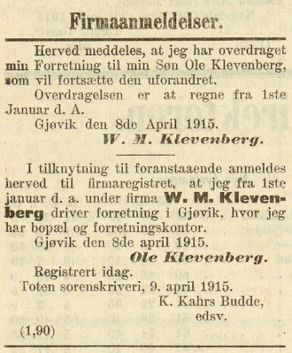 Han vokste opp i Hunnsvegen 7/9 i Gjøvik, der Gjøvik Meieri holdt til. Etter handelsutdannelse tok han i april 1915 over familiefirmaet fra faren W. M. Klevenberg. Adressen var seinere Trondhjemsvegen 2.