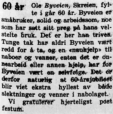 Den 25. oktober 1967 fylte han 60 år, og i anledning jubileet sto det i Totens Blad: «Byveien er småbruker, solid og arbeidssom, noe som har satt sitt preg på hans velstelte bruk. Det er her han trives. Tunge tak har aldri Byveien vært redd for å ta, og en «nauhjelp» til! naboer og venner, enten det er onhearbeid. eller annen hjelp, har for Byveien vært en selvfølge».