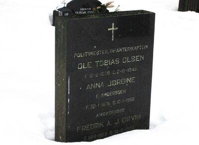 Politimester Ole Tobias Olsen blev begravet igår, og i kapellet på Vestre gravlund var hans store venneskare møtt tallrigt frem da høitideligheten begynte. Det var kommet en rigdom av blomster til båren, blandt annet fra Politidepartementet, Helgeland og Salten Lensmannslag, Vernepliktige Officerers Forening, Trondheim Skytterlag, Helegaland Dampskibslskap. ... Til slutt uttalte presten vakre minneord om den bortgangne. Han hadde ikke været redd for å si sin mening, men gjorde det ikke på en sårende måte - han hadde humør og et varmt hjertelag, var glad i musikk og det som var skjønt. ... Politibetjent Minge nedla en krans fra Halden politikammer md den siste takk. I den tid han har virket hos oss, sa taleren, lærte vi å sette uendelig stor pris på ham som den rettlinjede og humane chef og det eiegode menneske.