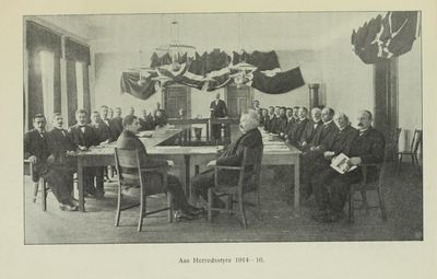 Herredsstyret for perioden 1914-16, ordfører på denne tida var Johan Knut Skancke. Møtelokalet var nytt i 1914 da bank- og kommunegården Åsgård ved Ås stasjon ble tatt i bruk. Illustrasjon fra boka Aas herred av N.A. Dahl, utgitt 1916.