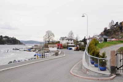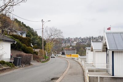 - Ormsundveien gjennom bildet til høyre, sett fra Bekkelagsveien 12 mot Ormøya. Til venstre for midten ligger Nedre Bekkelaget skole, nr. 2, bak denne Ormsund leir, nr. 16. Over veien for leiren ligger det daværende klubbhuset til Ormsund Roklub.Foto: Truls Teigen/Oslo Museum (1961).
