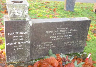 Oscar Schjøll er gravlagt i familiegrav på Vår Frelsers gravlund i Oslo. Tittelen Riksdirektør er benyttet på gravminnet.