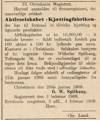 I 1909 etablerte O.W. Spilhaug A/S Kjættingfabrikken i Kristiania. Det første fabrikklokalet lå i Stockholmsgate 7 på Rodeløkka, og i februar 1912 ble en nyreist fabrikkbygning med adresse Hasleveien 28 tatt i bruk.