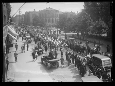 Syklistene er på veg opp Karl Johans gate i Oslo, og heies fram av publikum. På følgebilen bakerst står det: «Sportsmanden. Medarrangør Oslo-Stockholmsrittet». Bildet er muligens fra 1929, da rittet ifølge Aftenposten hadde samlet «veldige tilskuermasser».