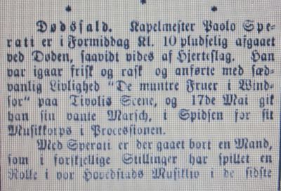 | Han var igaar frisk og rask, og anførte med sædvanlig livlighed "De muntre Fruer i Windsor" paa Tivolis scene, og 17de Mai gik han sin vante marsch, i spidsen for sit musikkorps i procesjonen. Med Sperati er der gaaet bort en mand som i forskjellige stillinger har spillet en rolle i vor hovedstads musikliv i de sidste 35 aar. ... Ikke blot legemlig, men ogsaa musikalskt var han av fødsel italiener. ... Der var liv og blod i den musik, ild og varme og rhytmer. Det var noget, som klang, som rev en med, som kunde fylde ens øren. ... Nogen fin musiker var Sperati ikke; men han var musiker fra top til taa ... . | ||