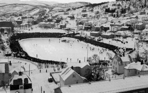 Vinteren 1960 må ha vært flott. Ta bare en titt på bildet som fotografen tok av banen – med alle brakkene rundt! Her bodde det flyktninger fra Nord-Troms og Finnmark fram til ca. 1951. Seinere ble brakkene blant annet brukt av Finnmarkskontoret og til å fylle behovet for boliger for «vanlige Harstad-folk» som sto i boligkø.
