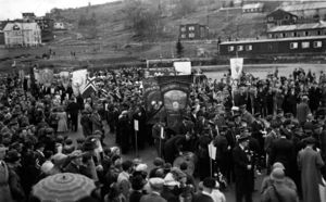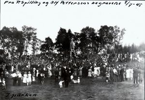 Elektrikeren Alf Pettersen (født 1915) og høyesterettsadvokat Per Spilling (født 1898) var med i den organiserte motstandsbevegelsen i Harstad-området under siste krigs okkupasjonsår. De ble angitt av infiltratøren Ole Udengen, arrestert og dømt til døden. De ble skutt på Setermoen onsdag 28. januar 1942. Søndag 8. juli 1945 var levningene bragt tilbake til Harstad. 10. juli skrev Fellesavisen: «En usedvanlig og gripende høytidelighet. – Den største gravferd i Harstads historie. – Flere tusen mennesker deltok i sørgehøytideligheten». Og videre «Over hele Harstad så en flaggene på halv stang, også statens splittflagg. Gravferden foregikk fra Parken, der de to kistene sto vakkert oppunder en liten haug». Det var møtt fram om lag 3000 mennesker. Harstad Orkesterforening spilte Johan Svendsens «Andante funèbre». Mandskoret sang «Norge mitt Norge» med Arthur Grønningsæther som solist. Etterpå tonet folkeskarens tolkning av «Nærmere deg, min Gud» ut over Parken. Prost Steinholt holdt talen. Harstad Mandskor sang og så ble kistene båret bort; Spillings kiste av kolleger i Harstad; sakførerne og advokatene. Alf Pettersen ble båret av kamerater og venner. Så satte det største likfølge som er sett i Harstad seg i bevegelse. Divisjonsmusikken gikk i teten og spilte Chopins «Sørgemarsj». Følget gikk over Sama og til Harstad gravlund.
