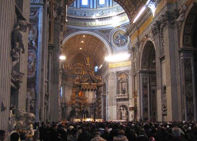 Motiv fra Peterskirken i Roma 8. desember 2005, hvor det ble avholdt en jubileumsmesse på dagen 40 år etter avslutningen av det andre Vatikankonsil. Den da nyvalgte paven, Benedict XVI (tiltrådte 19. april 2005), var selv til stede, og kan skimtes på dette bildet, i midten oppe ved alteret.