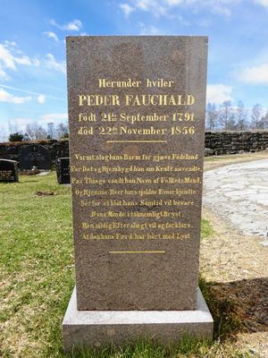 Peder Fauchalds gravminne på Hoff kirkegard, nesten inntil sørveggen på kirka.