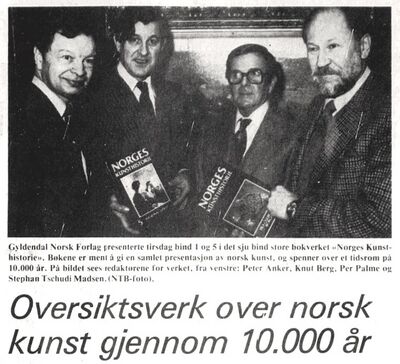 Faksimile fra Glåmdalen 4. februar 1981; utsnitt av omtale av utgivelsen av verket Norges kunsthistorie (Gyldendal). Per Olaf Palme var en av redaktørene. På bildet i faksimilen ses han som nr. 2 fra høyre.