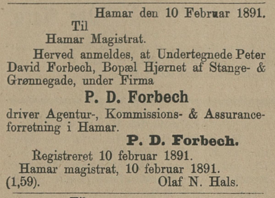 - Peter David Forbeck i folketelling 1891 for Hamar kjøpstad fra Digitalarkivet