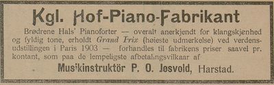 I denne annonsen fra Haalogaland 14. november 1903 ser vi at Jøsvold også livnærte seg som forhandler av pianoer fra Brødrene Hals.