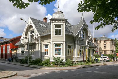 Parti fra Phønix gate i Fredrikstad. Tordenskiolds gate går til venstre, og i bakgrunnen skimter vi den rødmalte turnhallen.