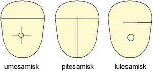 Pitesamiske runebommer er karakterisert ved at trommeskinnet, som sett rett ovafrå typisk sett er ovalt med ein relativt butt overende og smalnande nederende, er inndelt i eit øvre felt og to nedre felt — sjå diagram. Totalt finst det éi sikker og to trulige pitesamiske runebommer att i tillegg til éi som enten er frå Pite eller Lule lappmark: