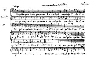 Frå eit handskrive manuskript: Dei første taktene av Hesqui hesqui av Abraham de Casseres.