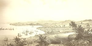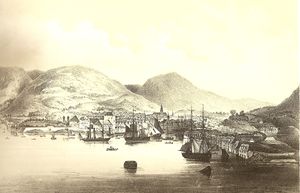 Bergen var på 1500-tallet en av Skandinavias største byer og var Norges største by like til 1830-tallet. Monopolet på handelen med Nord-Norge ble opprettholdt til 1789. Dette monopolet ga grunnlag for en betydelig sjøfart og industriell og håndverksmessig virksomhet knyttet til handel og sjøfart, som for eksempel reperbaner, skipsverft, møllevirksomhet med mer. Basisvirksomheten førte i sin tur til avledet tjenesteytende virksomhet og ga grunnlaget for den store befolkningsmengden. Bildet av Bergen fra 1840-årene viser i bakgrunnen Bergenhus festning, Bryggen og mange kirkespir. På den tiden hadde dampskipet blitt vanlig langs Norges kyst, og på havnen er et damskip med skovlhjul synlig.