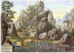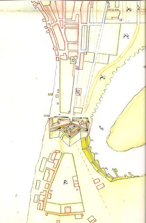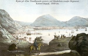 Trondhjem er i tidens løp som andre norske byer blitt hjemsøkt av flere bybranner med brannen i 1681 som den mest kjente. Etter denne bybrannen ble Caspar de Cicignon tilkalt for å lage en ny plan over byen. Trondhjems byplan regnes som det fremste eksemplet på barokke byplanidealer i Norge. I 1708 opplevde Trondheim nok en storbrann. Bildet av Trondhjem er sett fra Byåsen og viser den smale landtungen som gir adgang til byen gjennom en port. Byen er omkranset av sjøen på den ene siden og Nidelven på den andre siden. I bakgrunnen ses Domkirken og Christiansten festning. Byen hadde derfor en god beliggenhet ved forsvar mot fiender.