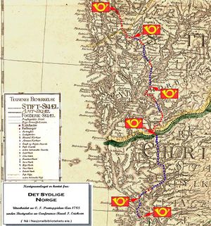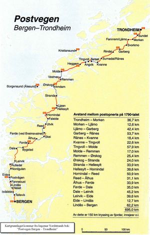 Kartskissen for ruten mellom Bergen og Trondhjem er kopiert fra boken Postvegen Bergen – Trondheim av Ingemar Nordstrand. Samkultgruppen har markert med posthorn steder som omtales i kapitlene. På kartskissen har forfatteren angitt antall poståpnerier og avstand mellom disse.