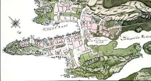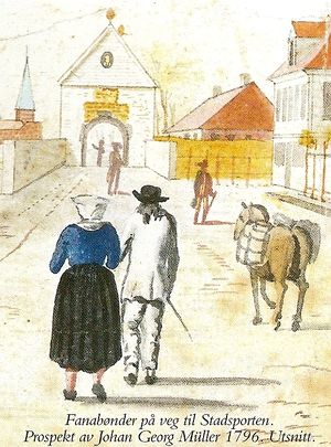 Kartbildet som er vist over Bergen, heter Carta over Bergen og er fra 1768. Kartet viser øverst Vågen med Bergenhus festning, Håkonshallen og Rosenkrantztårnet. Innerst i Vågen ligger Bryggen. Nederst på kartet stikker landtungen Nordnes ut. Til høyre på kartet kom postveien inn fra Os og passerte Stadsporten. Det neste bildet viser Fanabønder på vei mot Stadsporten, som posten måtte passere på sin vei inn i Bergen. Postveien mellom Bergen og Trondheim løp på nordsiden av Vågen og gjennom Åsane. Før 1850 fantes verken gatenavn eller husnummer i Bergen.