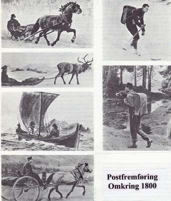 Lenge var samferdselen for dårlig til at postvesenet kunne benytte hest og vogn. Derfor var det vanlig at postføreren var ridende eller som på Vestlandet måtte benytte båt. Om vinteren ble slede eller i nord pulk benyttet. Flere steder som i Kystpostruten var fremkommeligheten så dårlig at postføreren måtte ta beina fatt og om vinteren benytte ski eller truger. Bildet viser vanlige fremføringsmåter for posten i forskjellige deler av landet omkring 1800.
