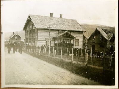 I 1920: Enkemann og sakfører Carl Anton Moursund med barna Liv (telegrafistinne) og Andreas Røst, husholderske Jenny Henriette Pedersen og skoleelevene Lars Murbræck og Wilhelm Kiil.