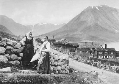 Stamstadgardane (Sygard og Nordgard) i Lom ca. 1880-1890. Tunet på Nordgard lengst borte. Der var mannen til Rønnaug fødd og oppvaksen, og ekteparet budde der iallfall periodevis. Kor lenge dei levde, og kvar dei døydde, er ikkje bringa på det reine.