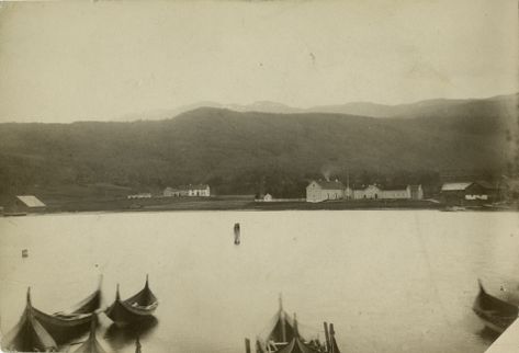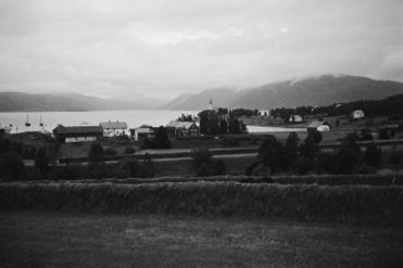 Handelsstedet til venstre, med kirken fra 1883 på neset i bakgrunnen. Forøvrig sees noe av den litt nyere bebyggelsen på stedet. Fotograf: Lyder Kvantoland 1948. Kilde: Nasjonalbiblioteket