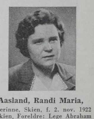 Randi Maria Aasland, født 1922 i Skien var lærer i Gjerpen og Skien. Foreldrene var lege Abraham Randinius Aasland og tannlege Tora Maria Aasland. Randi Maria tok artium ved Skien offentlige høgre almenskole i 1942. Videre tok hun husmorkurs ved Statens lærerinneskole i husstell i 1943. Lærerutdanningen tok hun ved Oslo lærerskole med eksamen i 1947. Seinere var hun vikar i Gjerpen noen år før hun ble ansatt i skolen i Skien.