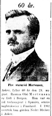 | Han titulerte seg både som godseier og statsråd. Begge var det dekning for og de ble ”godtatt” av bygdefolket. Rasmus Olai Mortensen på Bleiker hørte til dem av Askers gårdeiere som ikke var bonde i det hele tatt selv om gården ble drevet aldeles utmerket gjennom bestyrere. Men han var iallfall den av gårdeierne i bygden som virkelig tro til i norsk bondenæring ved sine mange og store verv i nasjonale kommisjoner og råd med det norske landbruk som arbeidsområde. | ||