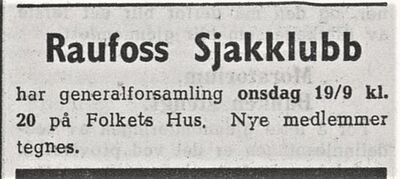 Raufoss sjakklubb kalte inn til sesongstart og årsmøte 19. september 1945. «Klubben har i sesongens løp hatt en klubbturnering», er det referert derfra, og «medlemstallet var i sesongen 29». Den sesongen det henvises til – eller i hvert fall første del av den – må ha foregått i tiden før tyskernes kapitulasjon, og tyder på at den gruppen som møttes for å spille sjakk under krigen ble betraktet som Raufoss sjakklubb.[6]